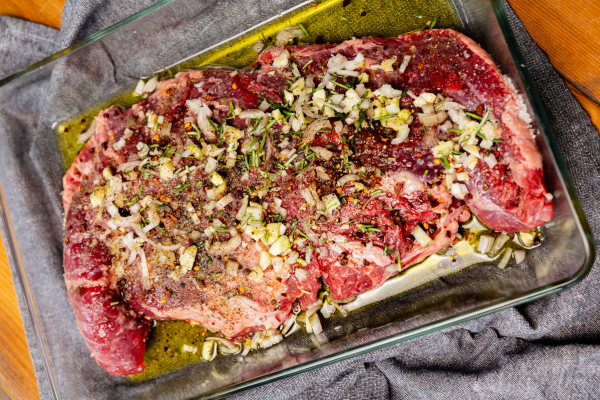 Στη συνέχεια, αλατοπιπερώστε γενναιόδωρα τη μπριζόλα flap και καλύψτε τη με τη μαρινάδα, φροντίζοντας να πάει παντού. Τοποθετήστε τη σε σακούλα που κλείνει αεροστεγώς ή σε ρηχό σκεύος και αφήστε τη να μαριναριστεί για τουλάχιστον 1 ώρα ή ιδανικά έως 12 ώρες στο ψυγείο.