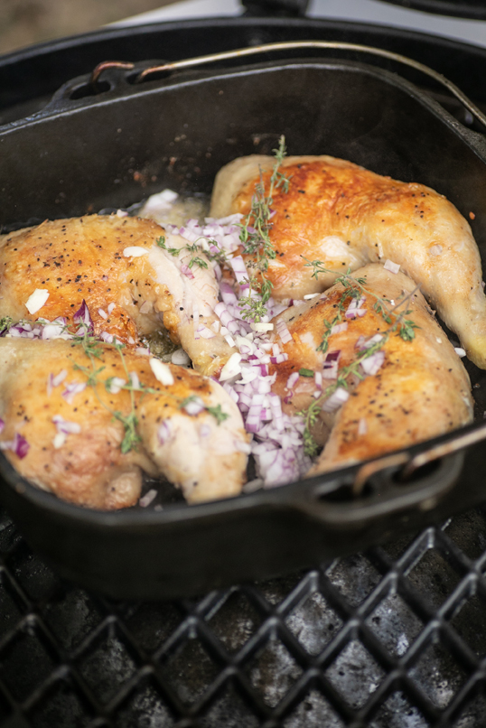 • Χαμηλώστε την ένταση στην ψησταριά, τραβήξτε τα μπαχαρικά στο πλαι και προσθέστε και το φρέσκο βούτυρο