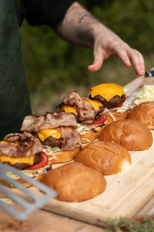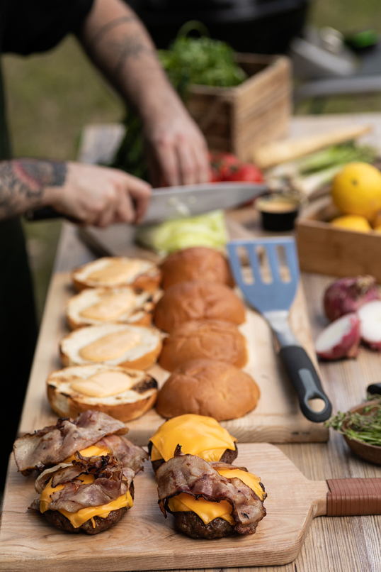 • Για τον κιμά ζητήστε από τον Κρεοπώλη σας τα εξής: να πάρει όσο ποιο λιπαρό ζώο μπορεί καθώς ένα καλό burger έχει αρκετό λίπος και να το περάσει το μίγμα μια φορά από μαχαίρι με διάμετρο 4χιλ. Μην το ζυμώσετε σχεδόν καθόλου απλά ανακατέψτε μια δυο φορές έτσι ώστε να ανακατευτεί καλά το μίγμα. Όσο περισσότερο δουλεύεις τον κιμά τόσο ποιο σφιχτός θα βγει στο τέλος. Ζυγίστε μπάλες των 200γρ και φορμάρετε στην πρέσα για burger της outdoorchef.
