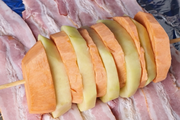 Ενα εντυπωσιακό σουβλάκι με πατάτα και γλυκοπατάτα, τυλιγμένο σε τραγανό bacon και αρωματισμένο με βούτυρο, σκόρδο και μαϊντανό, που ψήνεται αργά στη σχάρα και γεμίζει το BBQ με πλούσια αρώματα και απόλυτη νοστιμιά.